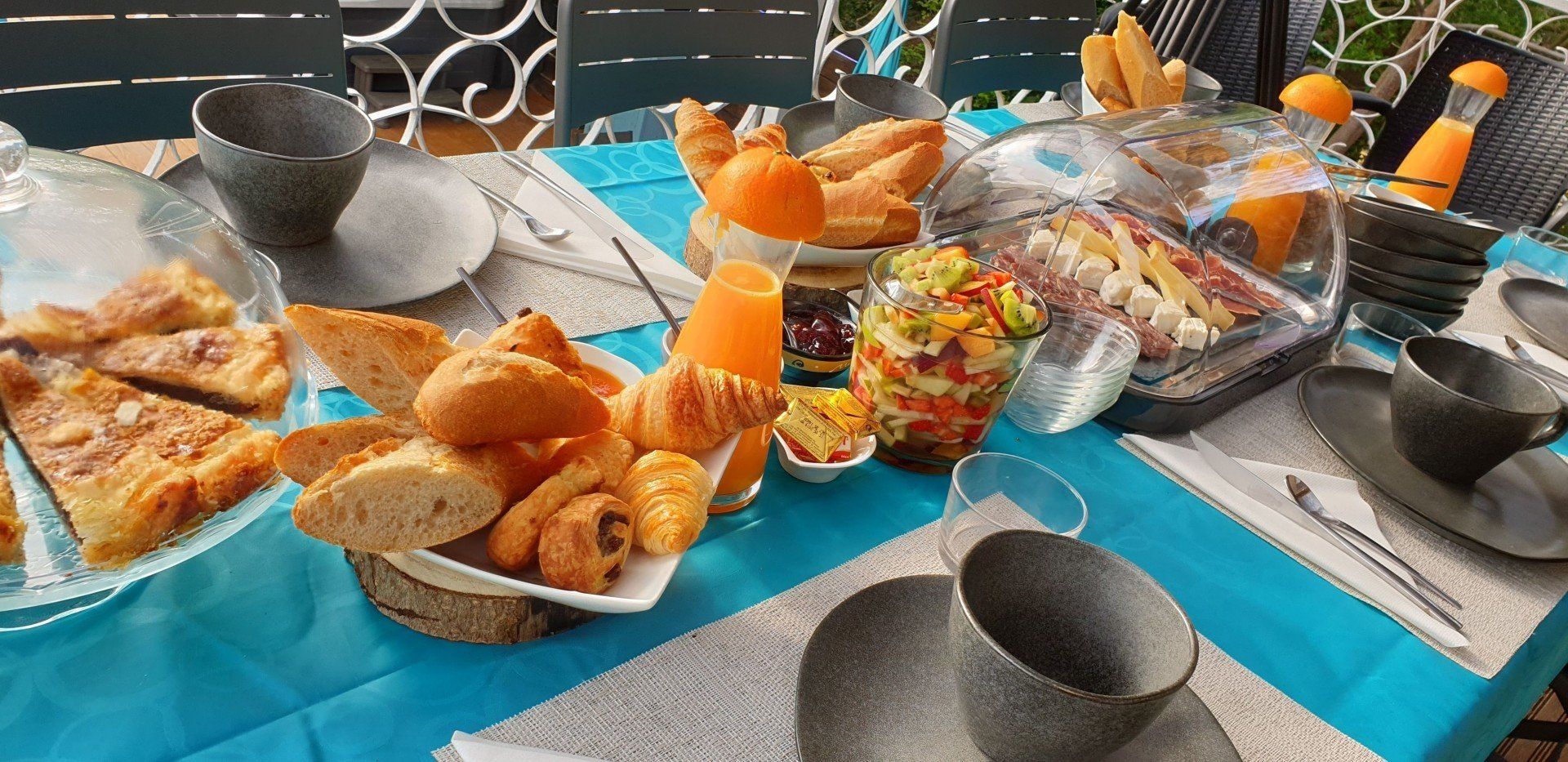 petit-déjeuner copieux, composé en grande partie de produits faits maison : gâteaux, viennoiseries, pain, confitures, jus d’orange pressé…