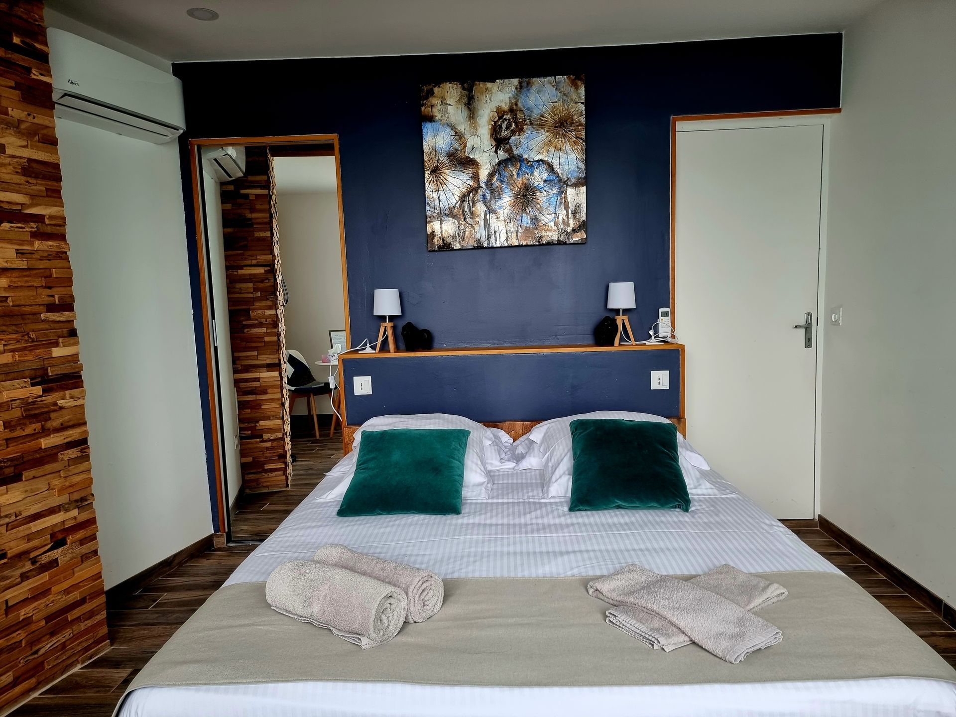 - 5 chambres climatisées, toutes équipées d’un grand lit, d’une salle d’eau privative, d’une literie haut de gamme, d’un écran TV et du wifi